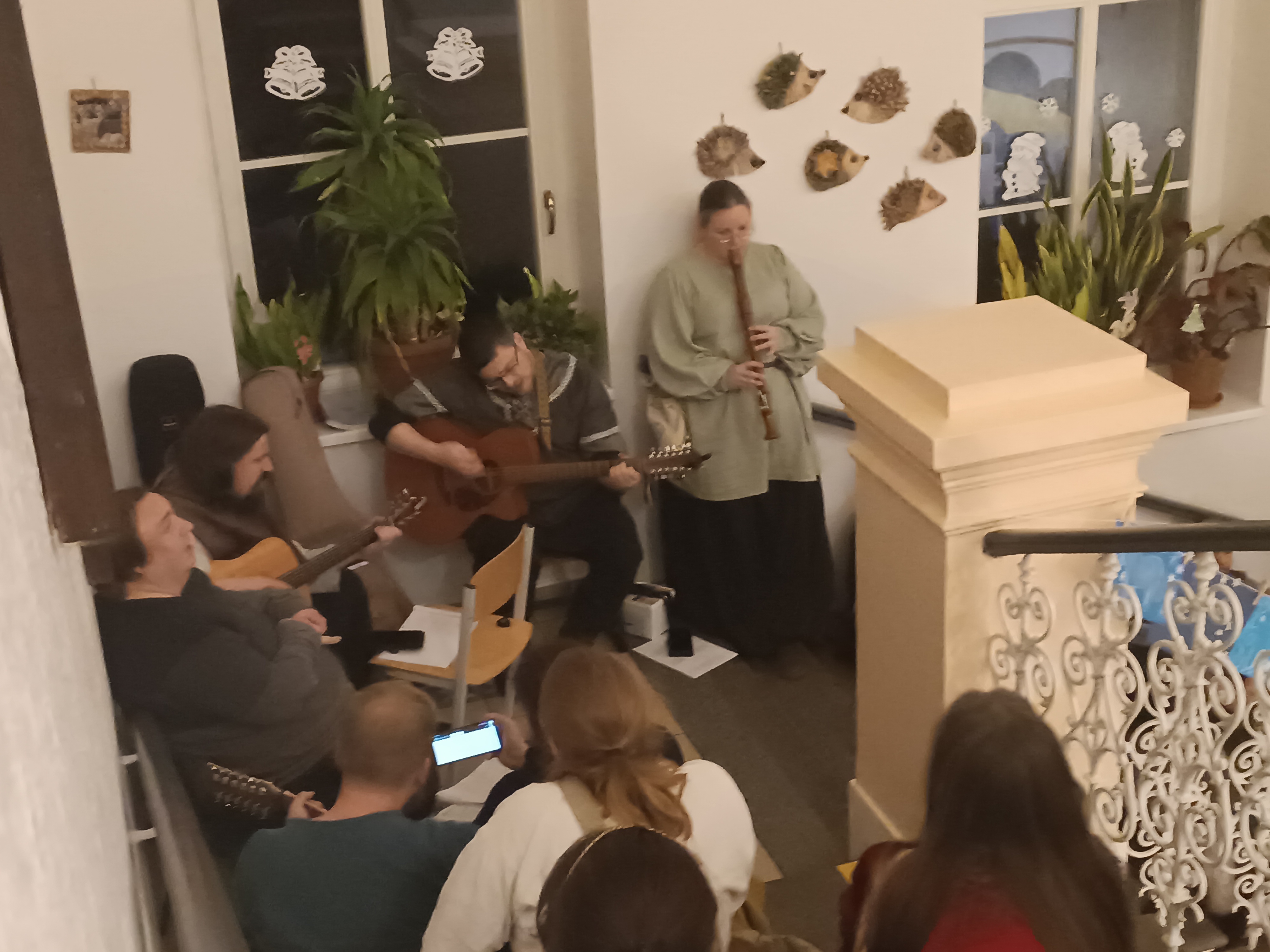 Na přelomu dní pak skupina přátel znovu využila akustické vlastnosti schodů ke svému koncertu, který pokračoval až ke třetí hodině ranní. Z písní, co zazněly, zmíním alespoň Když perlík zní a hlavně píseň Předák – o vrchním důlním plavčíkovi, co se po prokopnutí dna podzemní řeky plavil skrz Khazad-Dûm až před trůn Durina III.